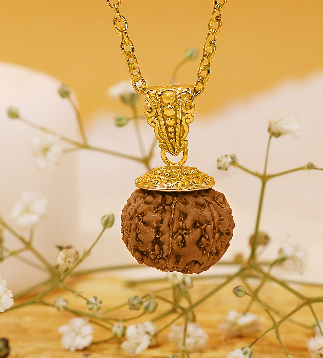 Our Fearlessness & Empowerment 9 Mukhi Power Bead Pendant features an activated & blessed 9 Mukhi Power Rudraksha Bead, handcrafted with protective and ornate caps.