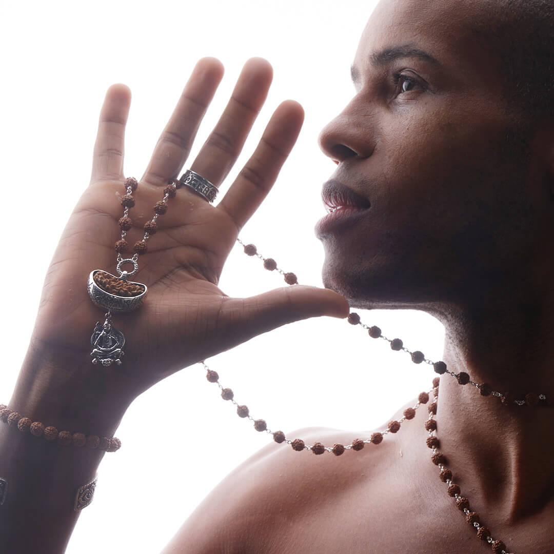 Shiva Enlightenment Rudraksha Meditation Mala Necklace is strung with 108 pieces genuine, high-vibrational rudraksha on wire with a rare and powerful 1 mukhi Rudraksha Power Bead encased in a handcrafted Shiva pendant